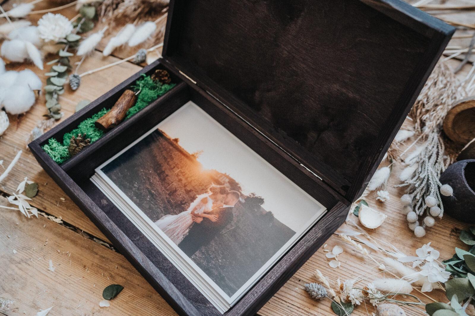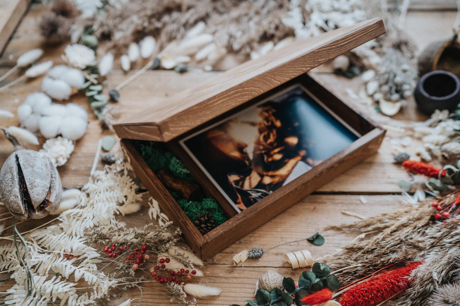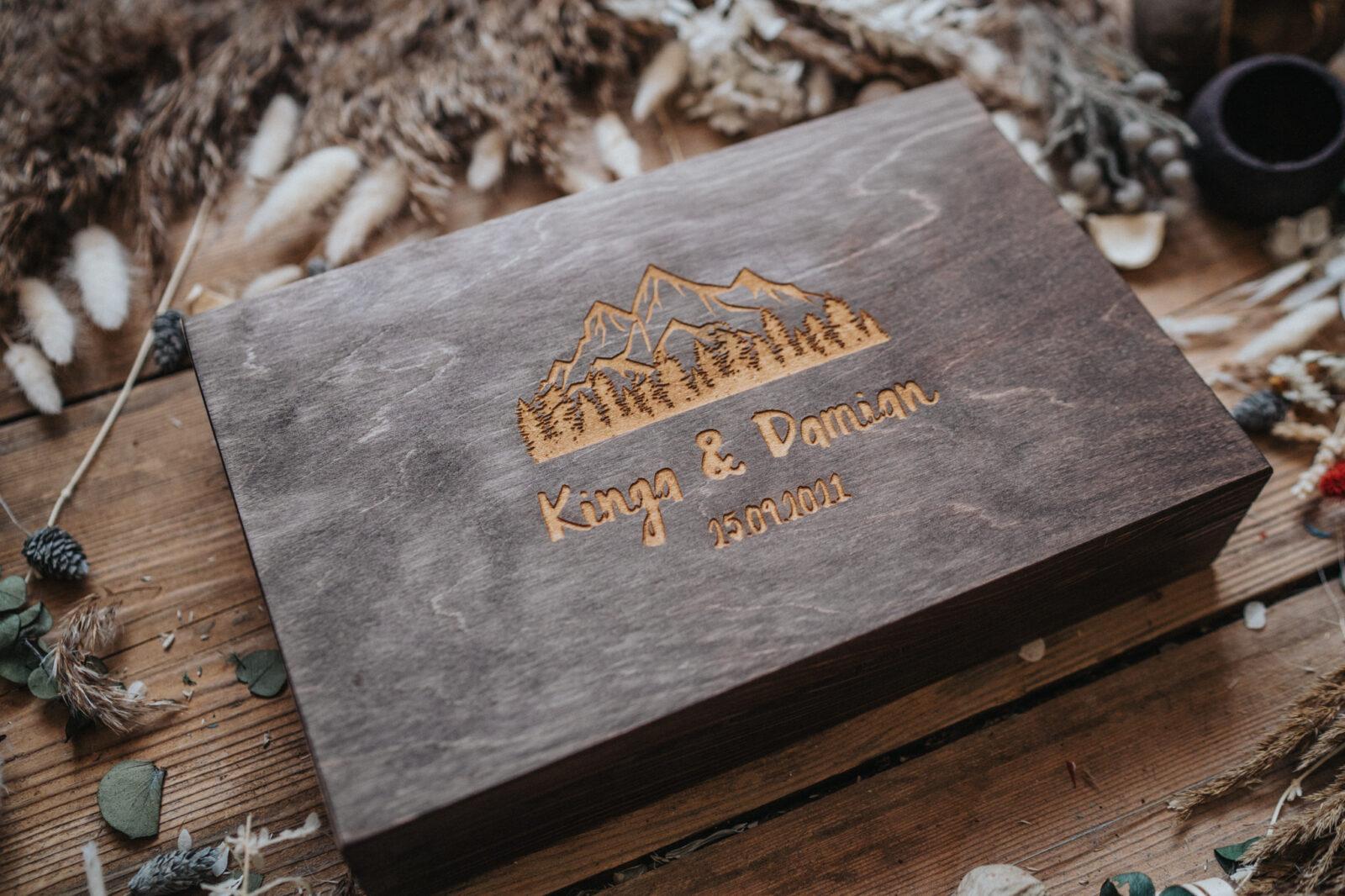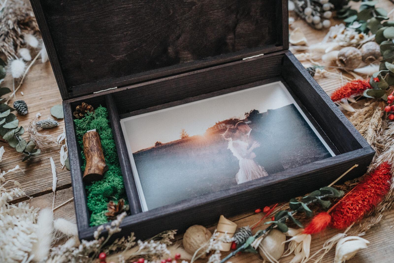 Pudełko jest wykonane z drewna sosnowego z przedziałem na pendrive i odbitki. Przedział na pendrive wypełniony jest mchem i szyszkami. Do zestawu dołączony jest także, jutowy sznurek do związania odbitek.