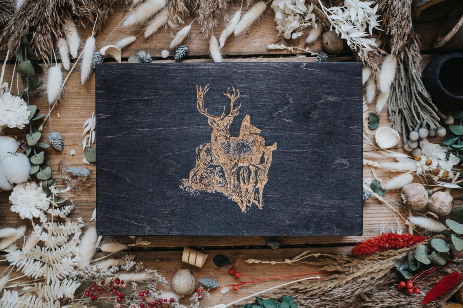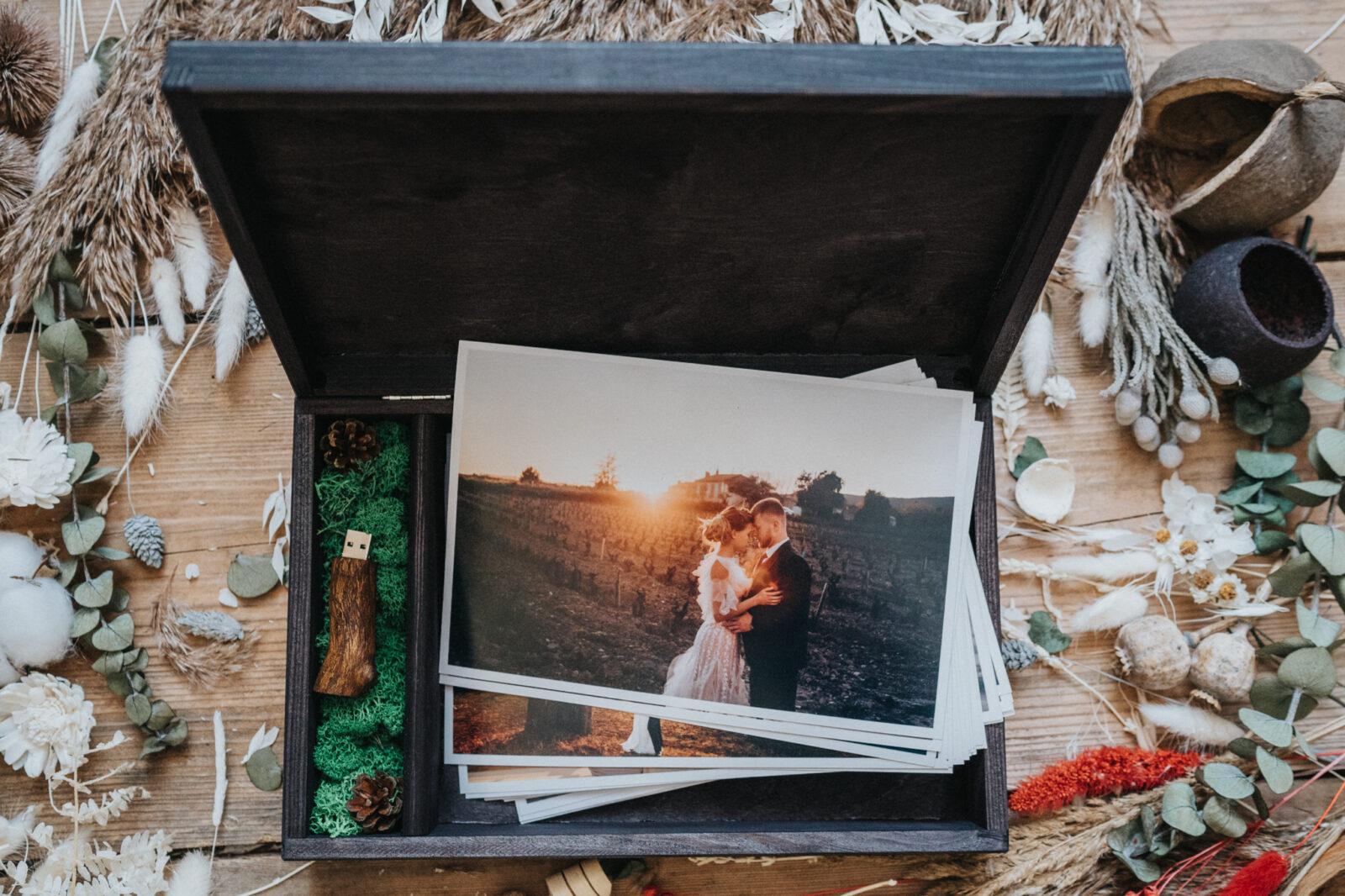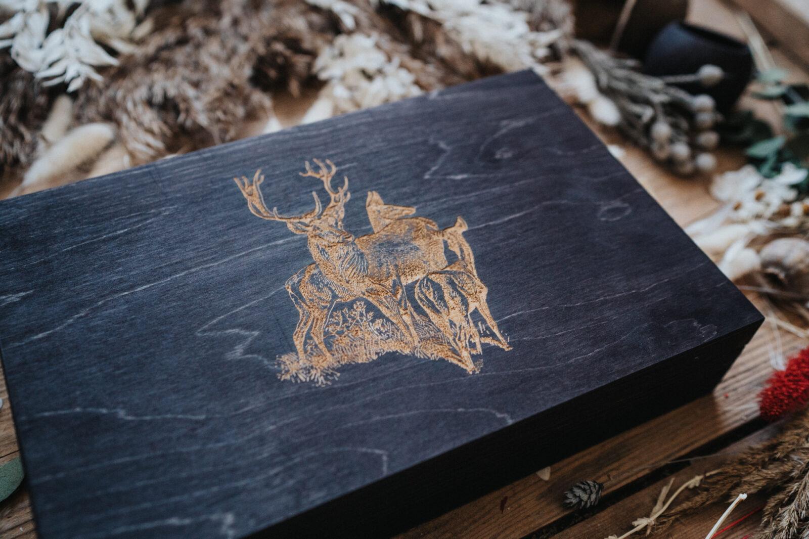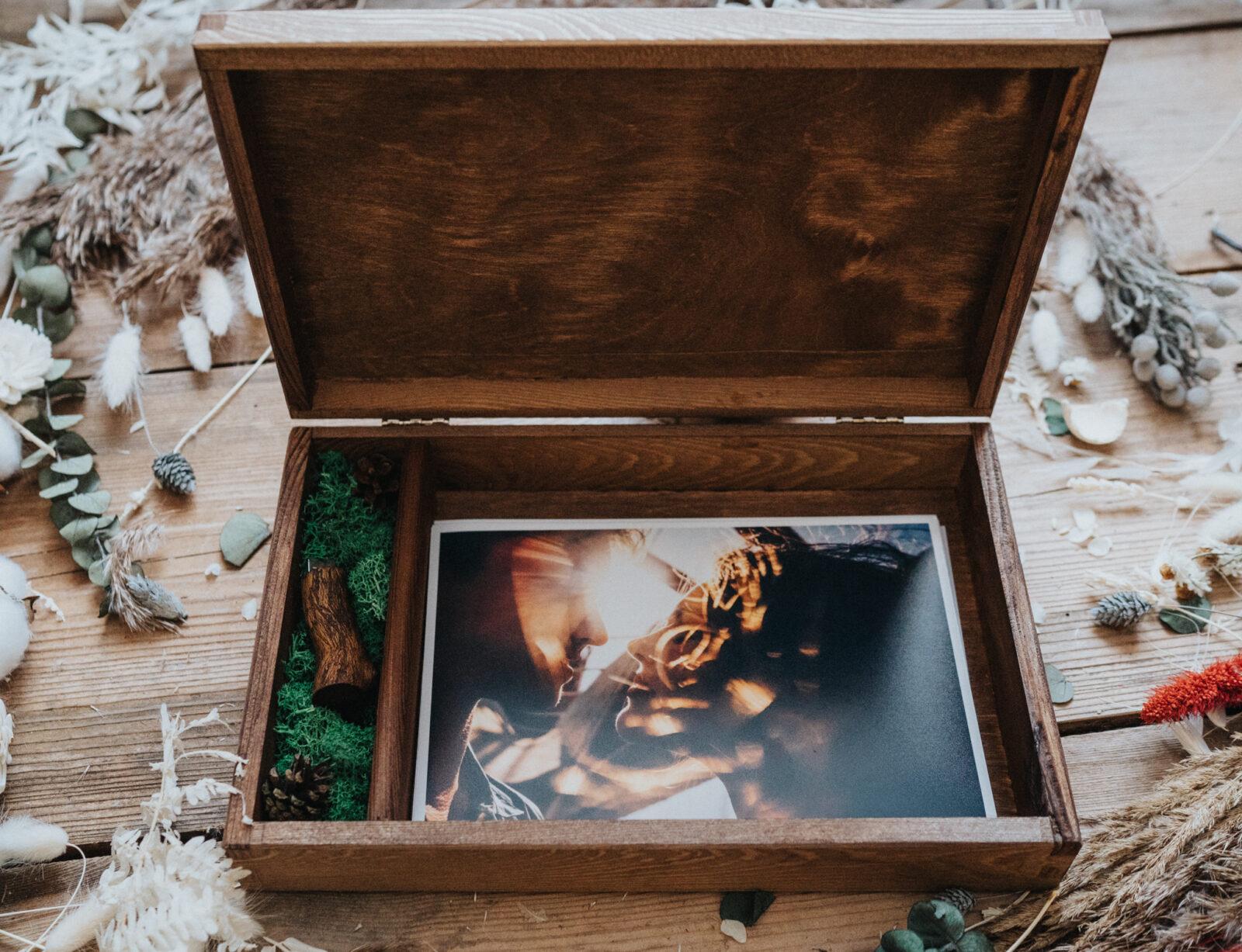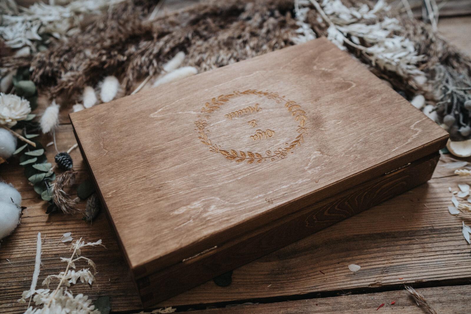 Pudełko jest wykonane z drewna sosnowego z przedziałem na pendrive i odbitki. Przedział na pendrive wypełniony jest mchem i szyszkami. Do zestawu dołączony jest także, jutowy sznurek do związania odbitek.