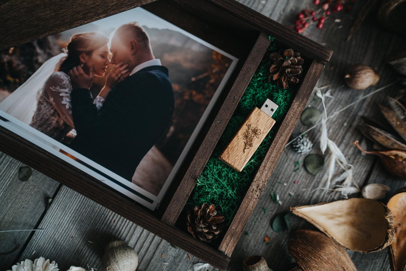 Drewniane pudełko skrzynka na zdjęcia 15x23cm i pendrive + Pendrive 3.0
