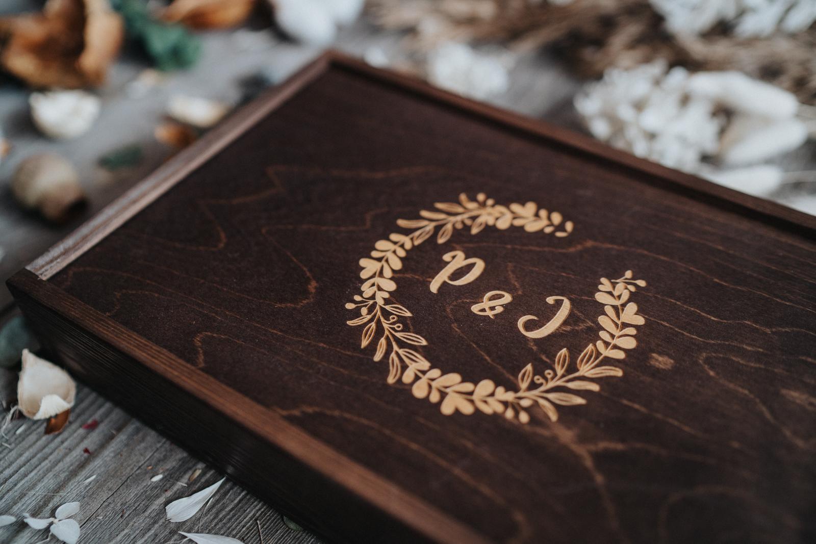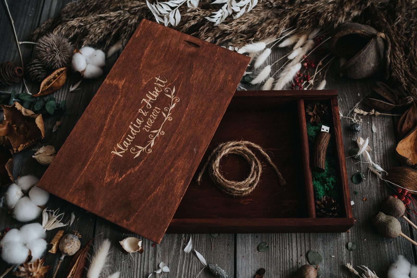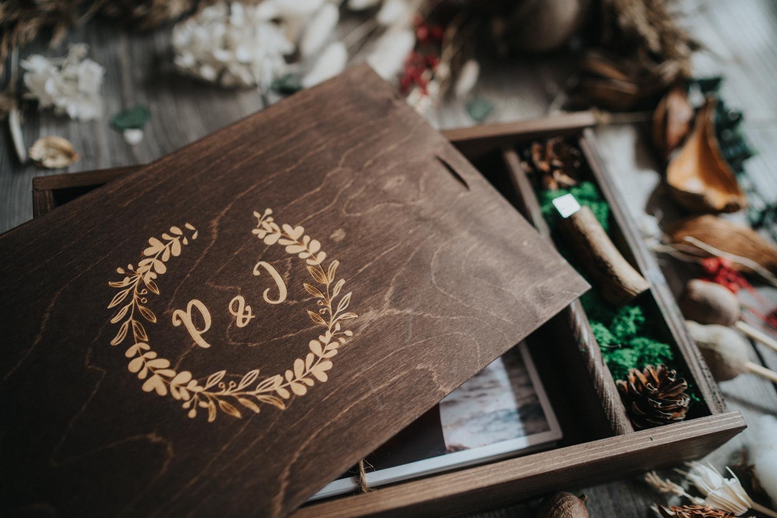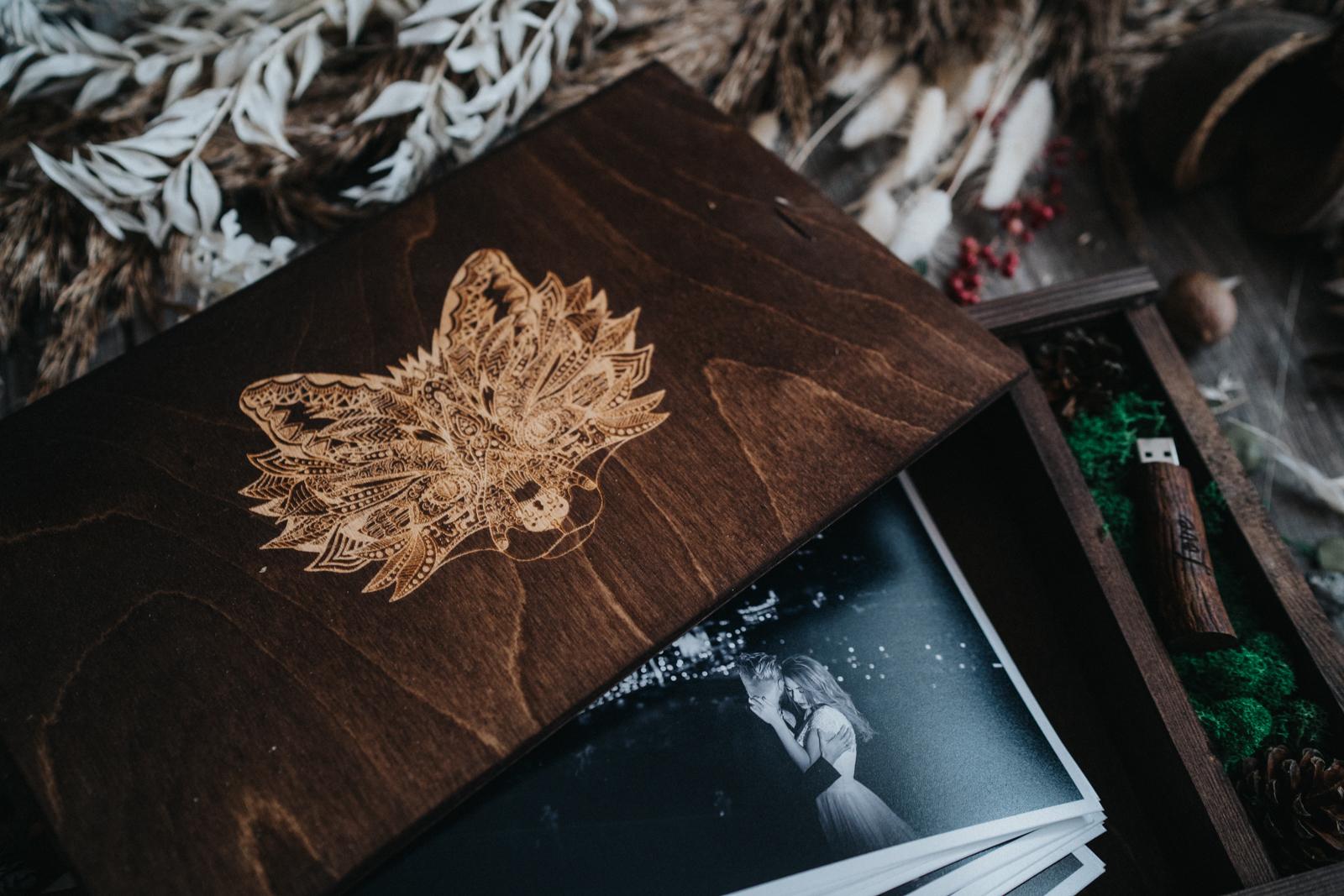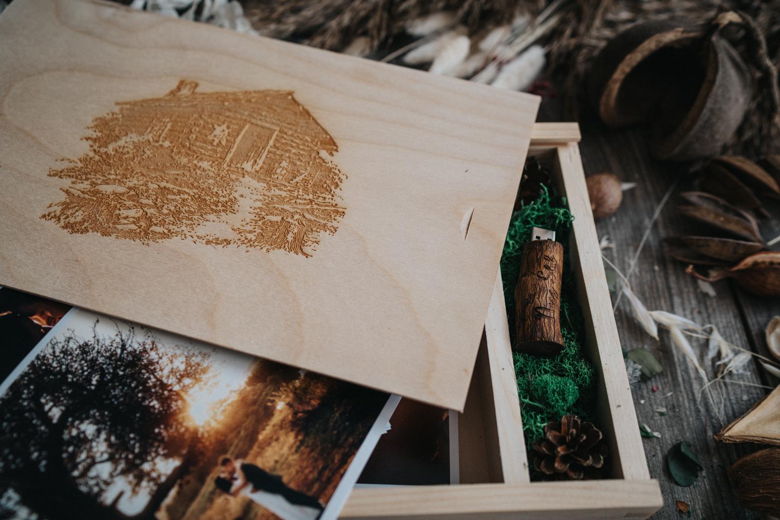 Pudełko jest wykonane z drewna sosnowego z przedziałem na pendrive i odbitki. Przedział na pendrive wypełniony jest mchem i szyszkami. Do zestawu dołączony jest także, jutowy sznurek do związania odbitek.