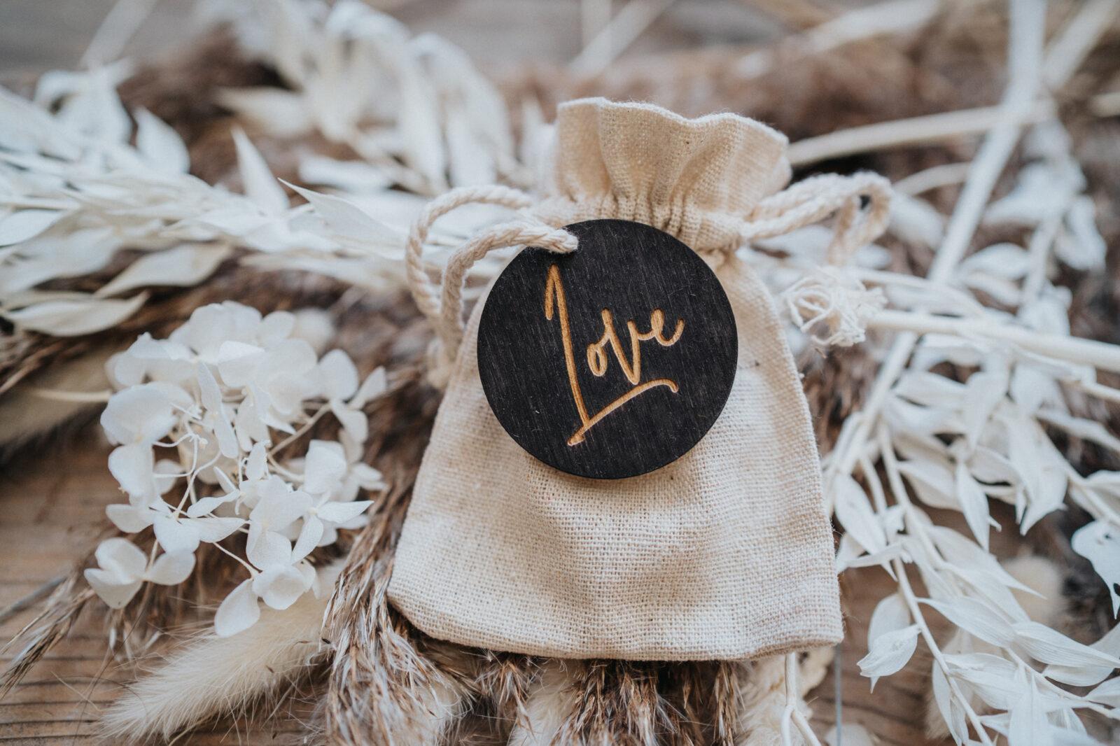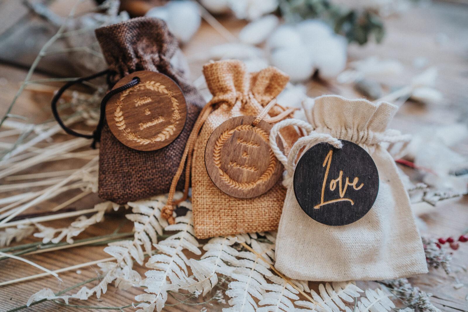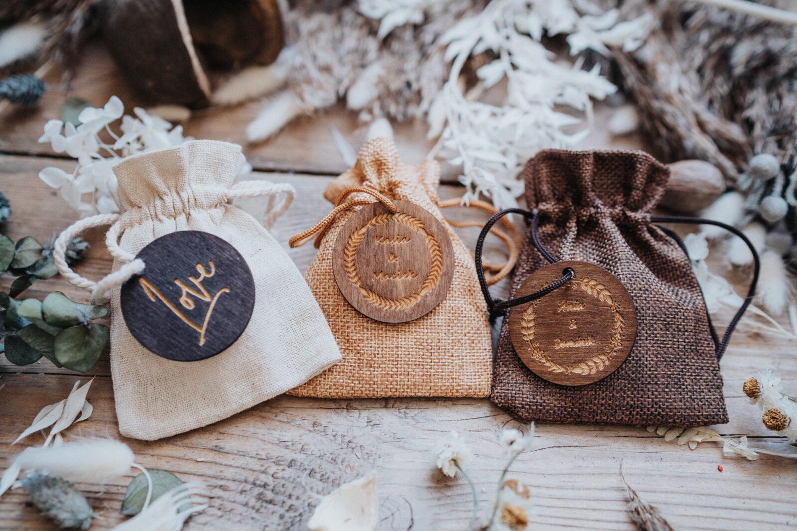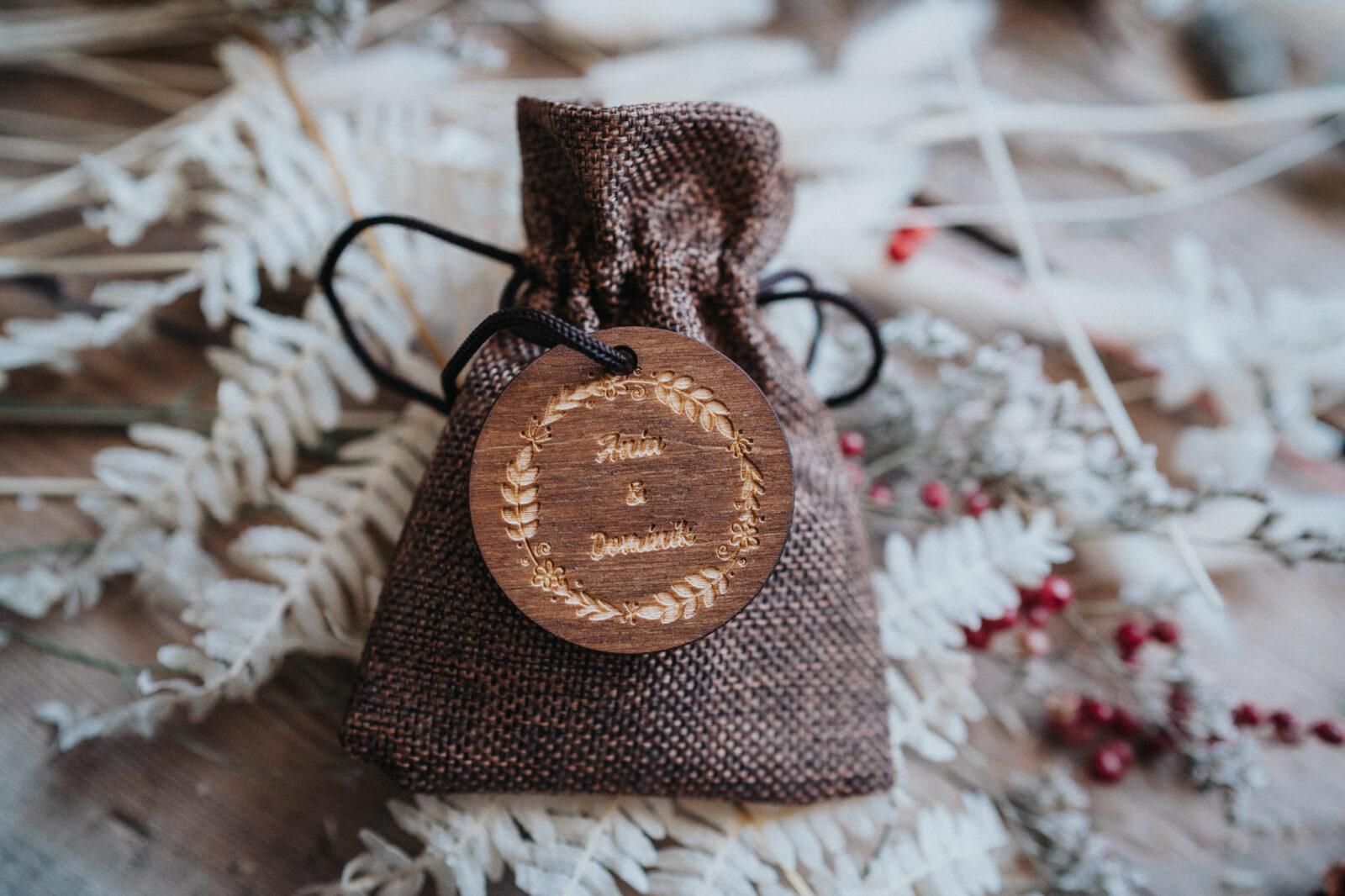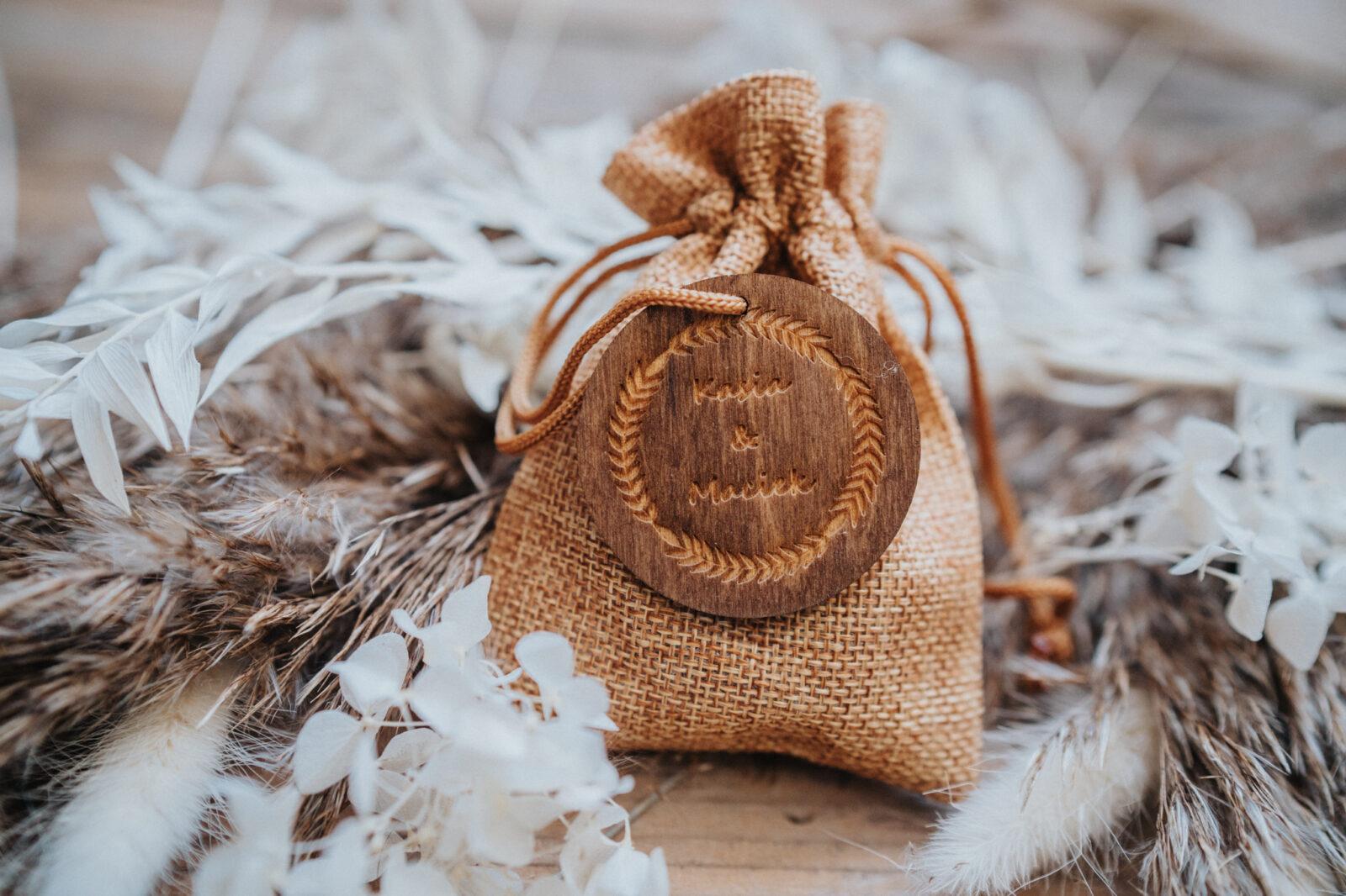 Jutowy woreczek dostępny w trzech kolorach z drewnianym krążkiem, na którym może znaleźć się jeden z naszych uniwersalnych grawerów.
